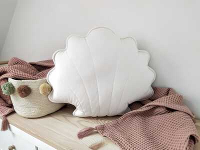 Dekoracyjna poduszka w kształcie muszli z wypełnieniem antyalergicznym. Poduszka doskonale sprawdzi się jako niebanalna dekoracja pokoju dziecięcego lub salonu a wzór tkaniny sprawi, że będzie prezentować się wyjątkowo w każdym wnętrzu. Poduszka uszyta jest z delikatnej, mięsistej tkaniny welurowej ze strukturą maleńkiej cegiełki i delikatnym połysku.